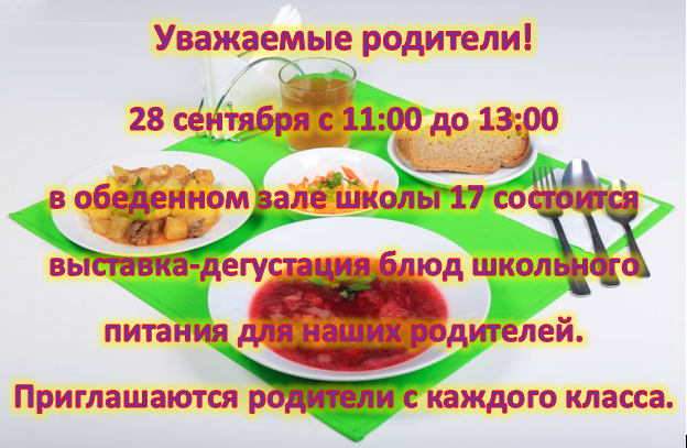 в обеденном зале школы 17 состоится выставка-дегустация блюд школьного питания для наших родителей. Приглашаются родители с каждого класса.