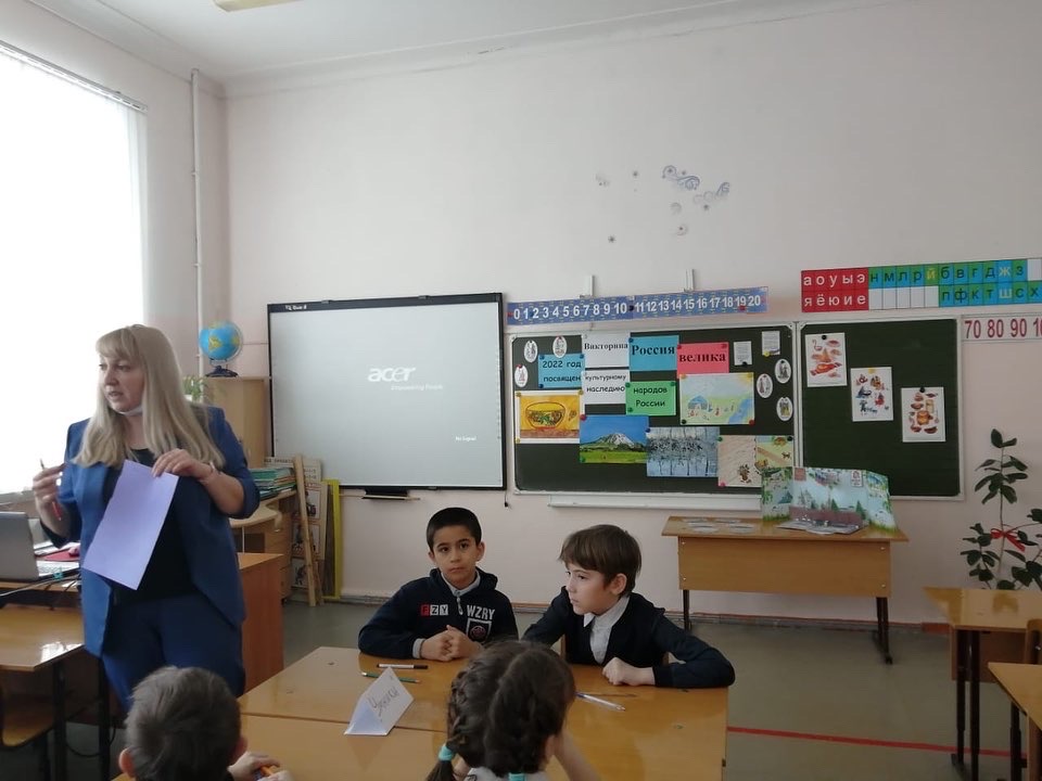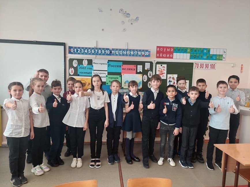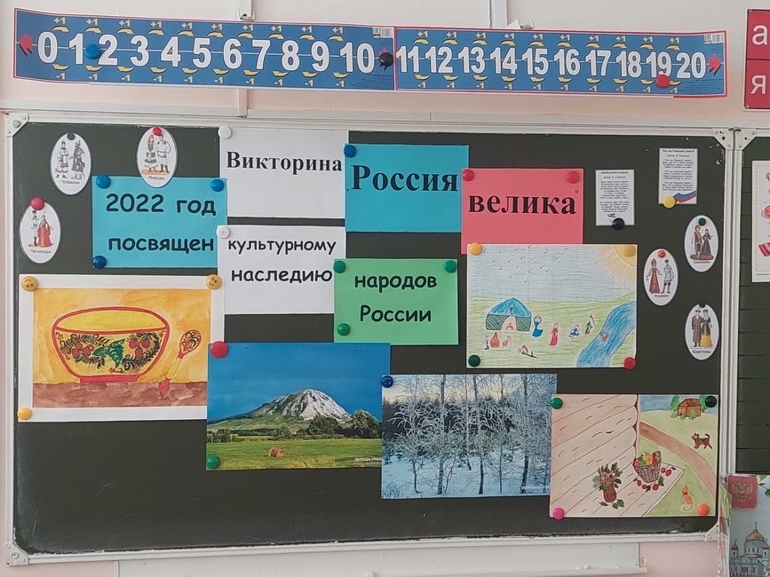 В 3-4 классах прошла викторина "Россия велика!", посвящённая году культурного наследия народов России. Ребята познакомились с обычаями, традициями русского и башкирского народов, а также отгадывали загадки о праздниках.
