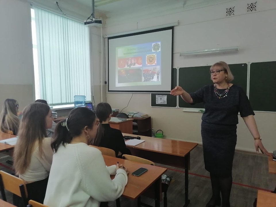 А на уроках ОБЖ Галина Геннадьевна рассказала ученикам 10-11 классов об истории создания и развития гражданской обороны.