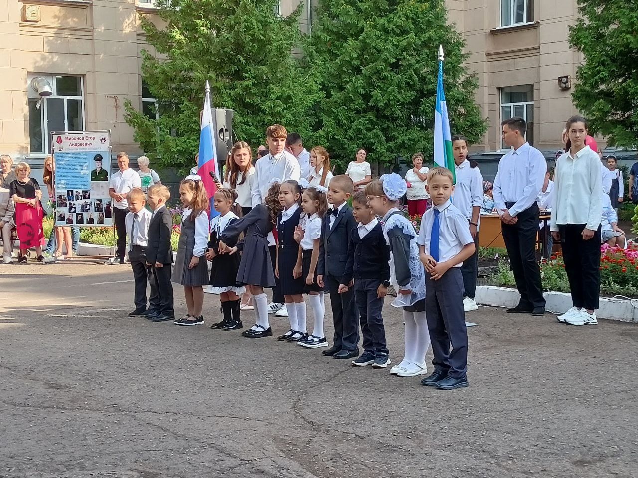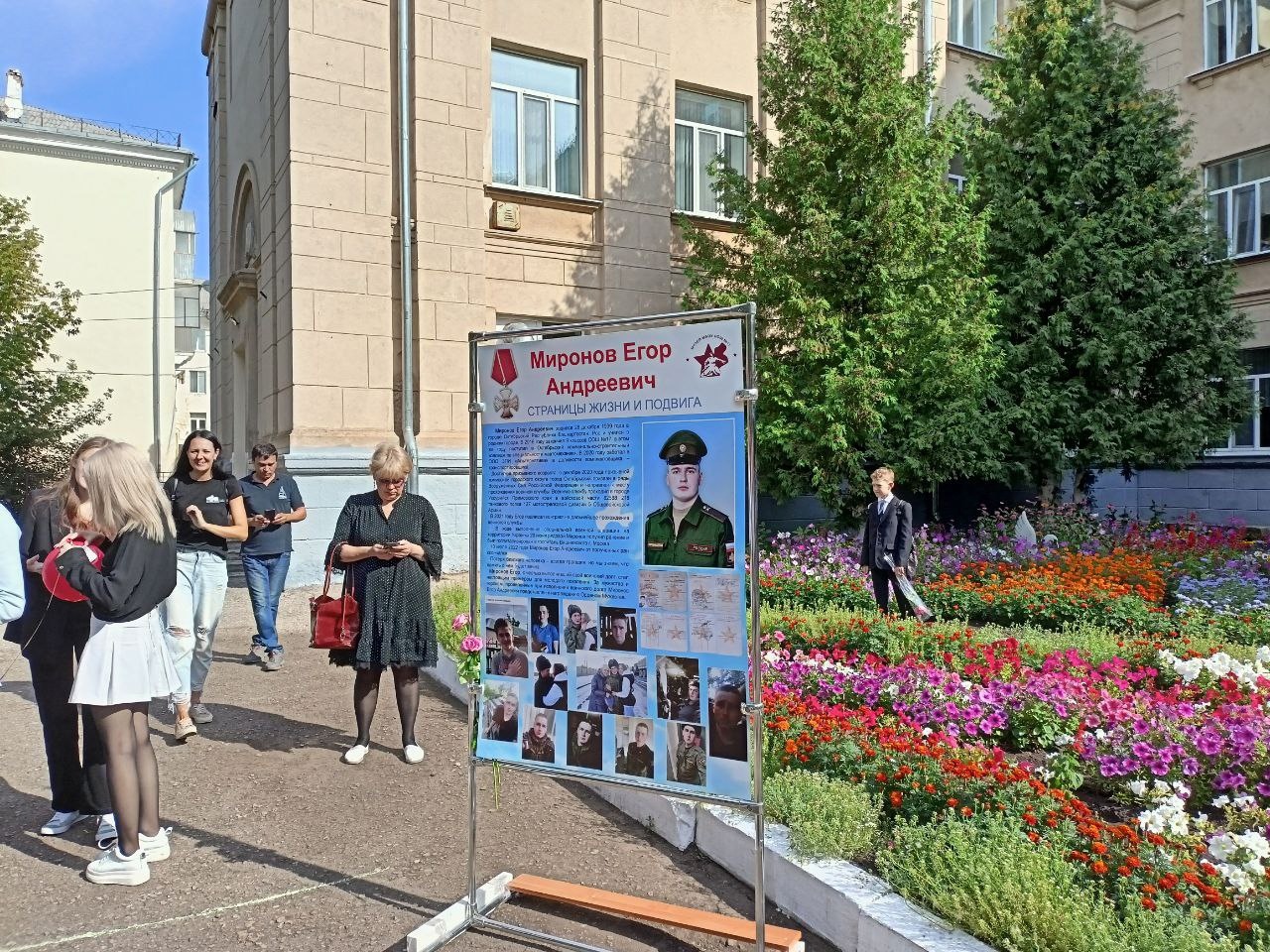 Директор Леонид Муратов напомнил ребятам о Егоре Миронове, выпускнике школы № 17, который погиб в ходе специальной военной операции на Украине. На пришкольной территории был установлен стенд, рассказывающий историю Егора.