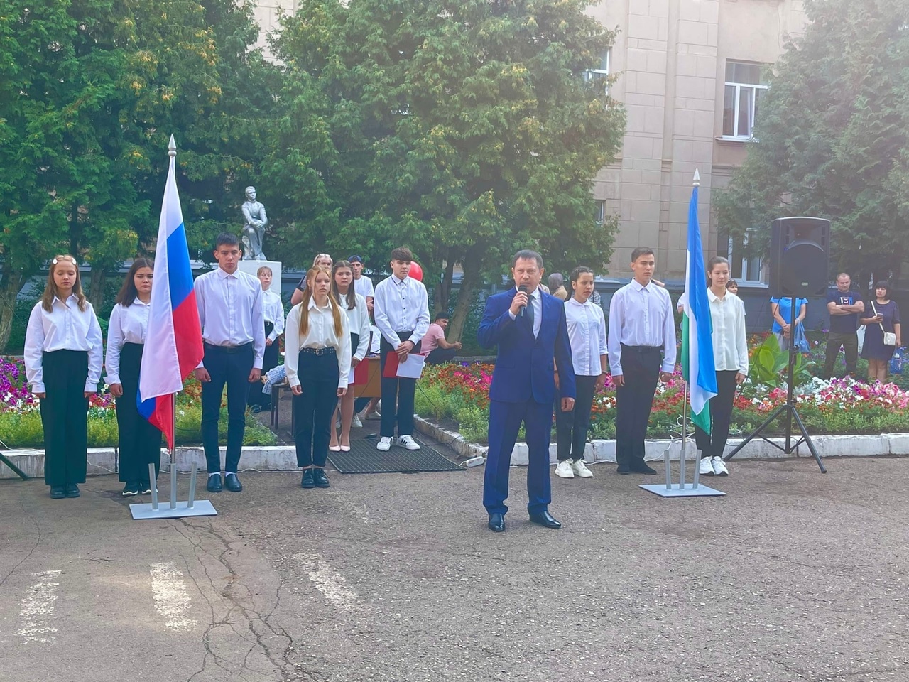 В школе № 17 Октябрьского линейка началась торжественно — лучшие ученики внесли флаги России и Башкирии под государственный гимн.