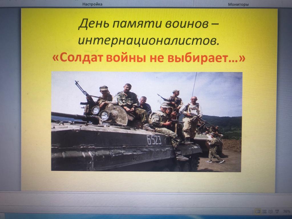 15 февраля в школе прошли Уроки Мужества, посвященные Дню памяти о россиянах, исполнявших служебный долг за пределами Отечества. Эта памятная дата установлена в честь воинов - интернационалистов, которые выполняли свой боевой долг за пределами границ своей родной страны. Ребята подготовили выступления на классные часы, смотрели видеофильмы и презентации. Память - это не только сохранение прошлого, но и забота о будущем.
