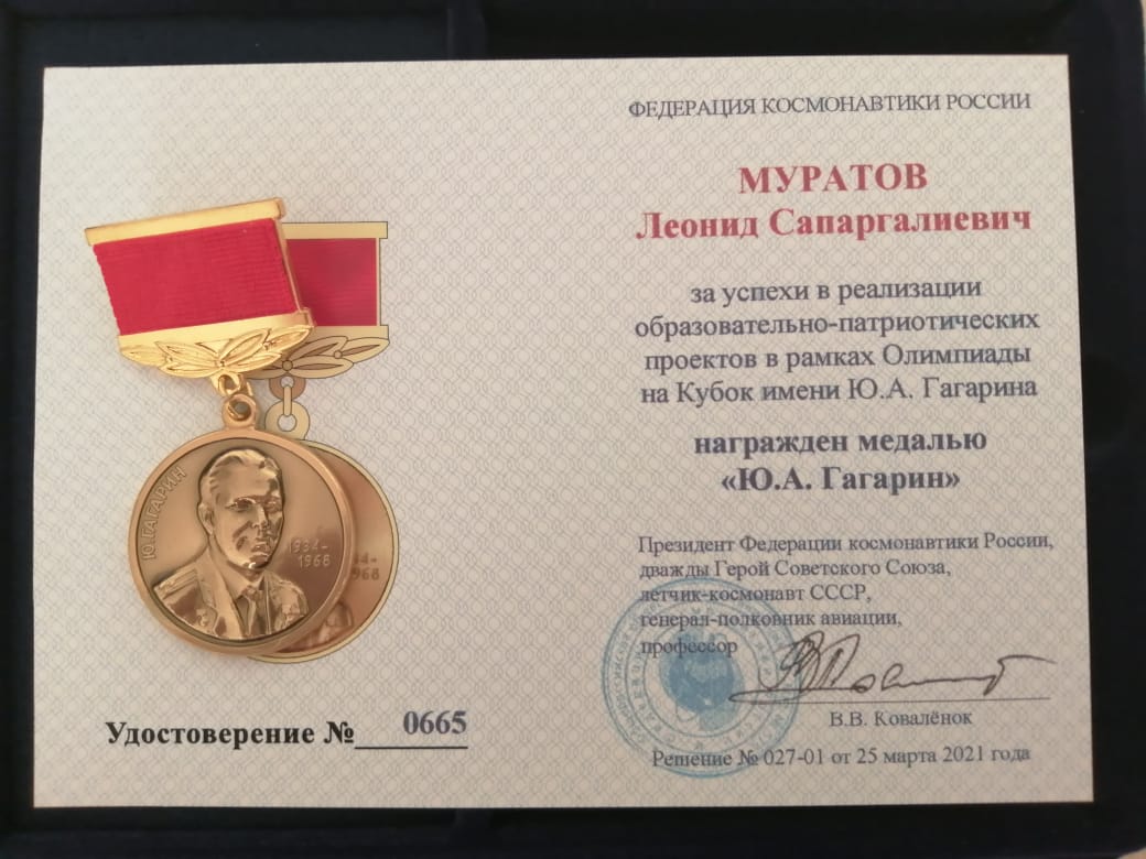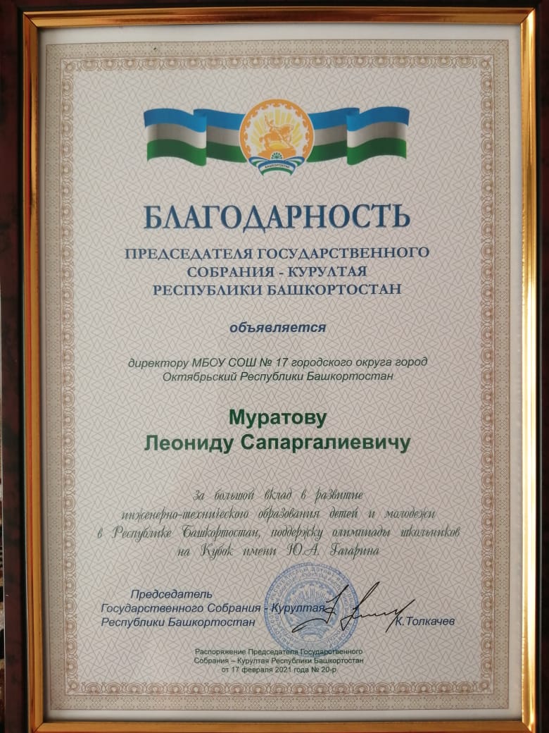 14 апреля 2021 года в Конгресс – холле «Торатау» г. Уфа состоялась Торжественная церемония вручения Благодарностей Председателя Государственного собрания – Курултая Республики Башкортостан К.Б. Толкачева работникам системы образования за значительный вклад в развитие инженерно-технического образования детей и молодежи в Республике Башкортостан, поддержку Олимпиады школьников на Кубок имени Ю.А. Гагарина.